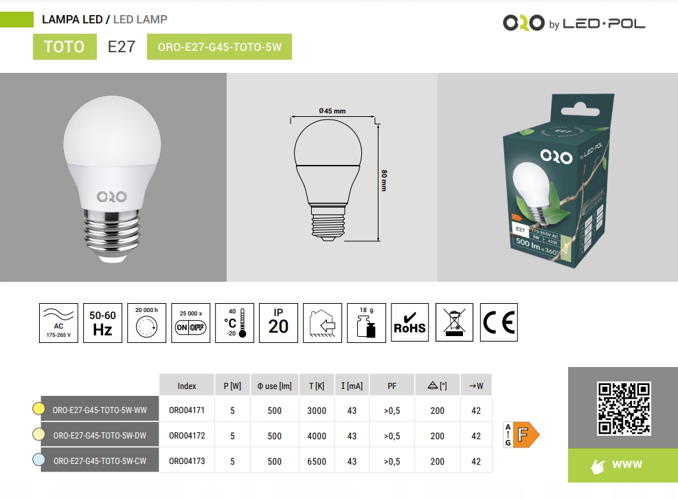 ŻARÓWKA LED ZIMNA BARWA ORO-E27-G45-TOTO-5W-CW